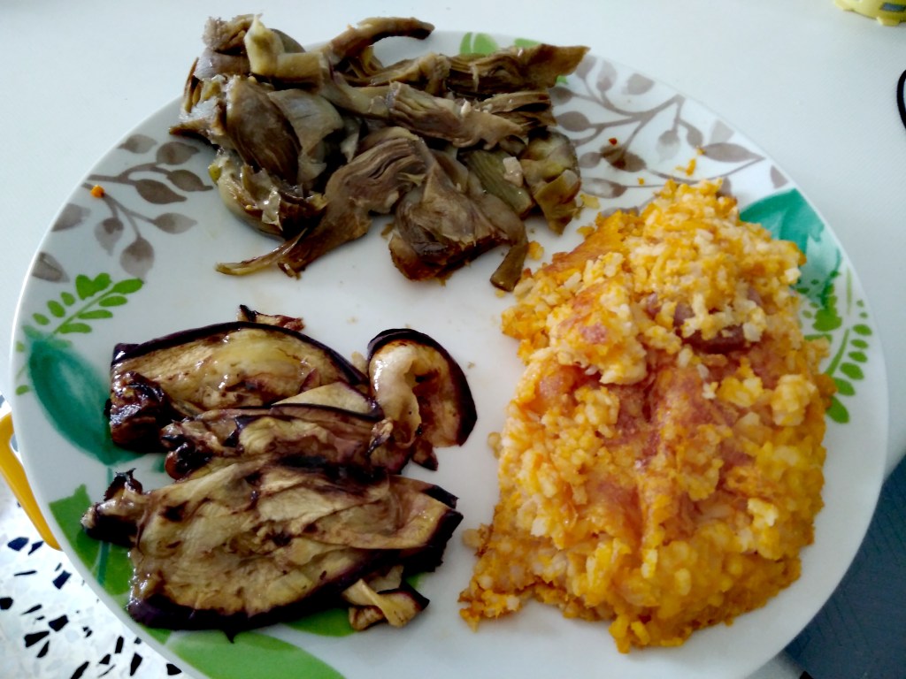Oggi. Timballo di riso, carciofini in umido e melenzane arrostite.