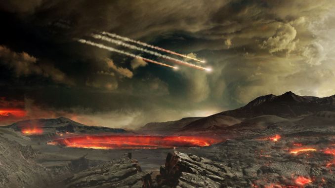 L’RNA è stato il primo mattone della vita, oggi molti scienziati condividono questa ipotesi, tuttavia nessuno sa spiegare il “dopo”, ossia come il mondo dell’RNA sia diventato il mondo di oggi. Un drammatico scontro tra la Terra e un asteroide può aver dato il via alla vita. C’è uno scenario che suggerisce che circa 4,47 miliardi di anni fa – solo 60 milioni di anni dopo la formazione della Terra, e 30-40 milioni di anni dopo la formazione della Luna da un precedente scontro planetario – un altro oggetto di dimensioni lunari impattò con la Terra ed esplose in una nuvola di ferro fuso e altri detriti. L’RNA è stato il primo mattone della vita, oggi molti scienziati condividono questa ipotesi, tuttavia nessuno sa spiegare il “dopo”, ossia come il mondo dell’RNA sia diventato il mondo di oggi. La grandinata di materiale metallico che ne derivò probabilmente durò decenni, se non secoli, e questo causava la disgregazione della molecola di acqua in ossigeno e idrogeno molecolari. L’ossigeno libero si legava al ferro, creando enormi depositi color ruggine di ossido di ferro sulla superficie del nostro pianeta. L’idrogeno, invece, andò a formare una densa atmosfera che si dissipò molto lentamente nello Spazio, nell’arco di 200 milioni di anni. L’RNA è stato il primo mattone della vita, oggi molti scienziati condividono questa ipotesi, tuttavia nessuno sa spiegare il “dopo”, ossia come il mondo dell’RNA sia diventato il mondo di oggi. Un drammatico scontro tra la Terra e un asteroide può aver dato il via alla vita. C’è uno scenario che suggerisce che circa 4,47 miliardi di anni fa – solo 60 milioni di anni dopo la formazione della Terra, e 30-40 milioni di anni dopo la formazione della Luna da un precedente scontro planetario – un altro oggetto di dimensioni lunari impattò con la Terra ed esplose in una nuvola di ferro fuso e altri detriti. L’RNA è stato il primo mattone della vita, oggi molti scienziati condividono questa ipotesi, tuttavia nessuno sa spiegare il “dopo”, ossia come il mondo dell’RNA sia diventato il mondo di oggi. Ne seguì un progressivo, lento raffreddamento della Terra, ed è in questo intervallo di tempo che semplici molecole organiche cominciarono a formarsi sotto la coltre di idrogeno. Quelle molecole, secondo alcuni scienziati, si unirono a formare l’RNA, l’acido ribonucleico, elemento molecolare che molti considerano protagonista dell’alba della vita.